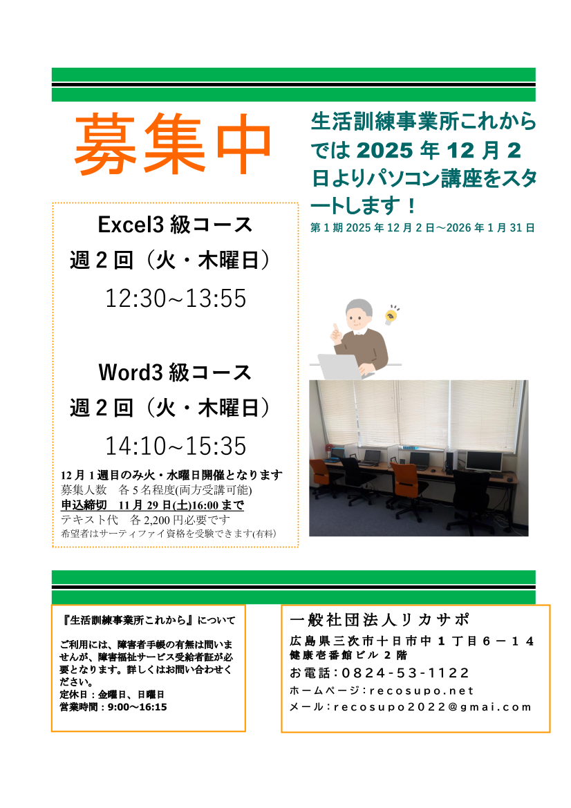 12月2日(火)から「PC講座」Excelコース、Wordコースが始まります。